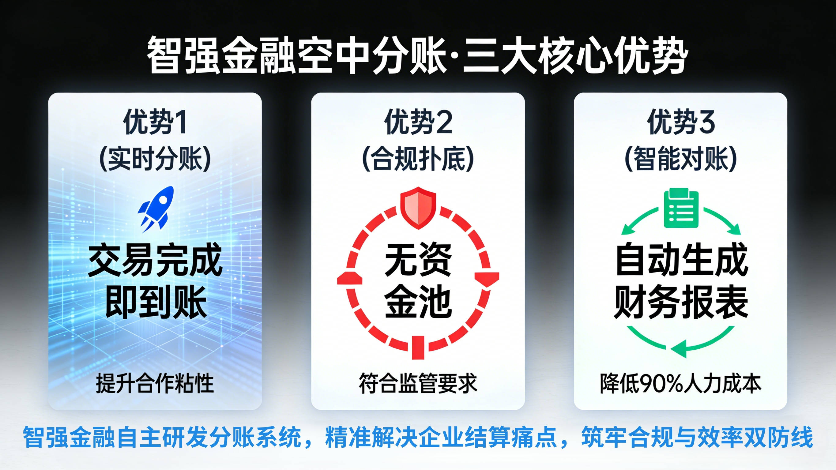 相较于传统代收代付,智强金融空中分账系统具备三大核心优势,精准解决企业结算痛点: