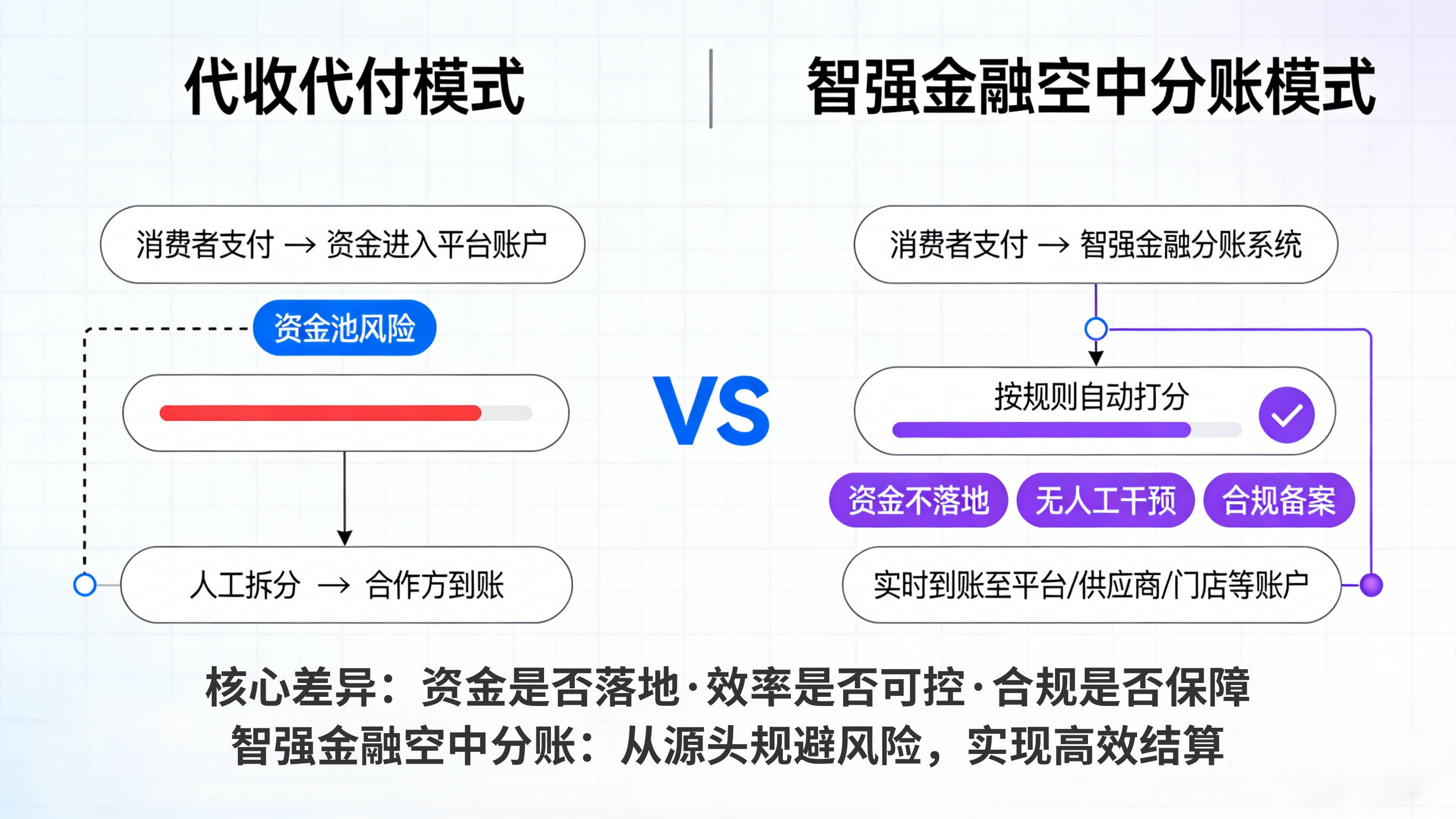 在此背景下,“空中分账”作为更合规、高效的结算解决方案,逐渐成为平台型企业的转型首选。那么,空中分账与传统代收代付究竟有何本质区别?智强金融又能为企业提供怎样的专属支持?