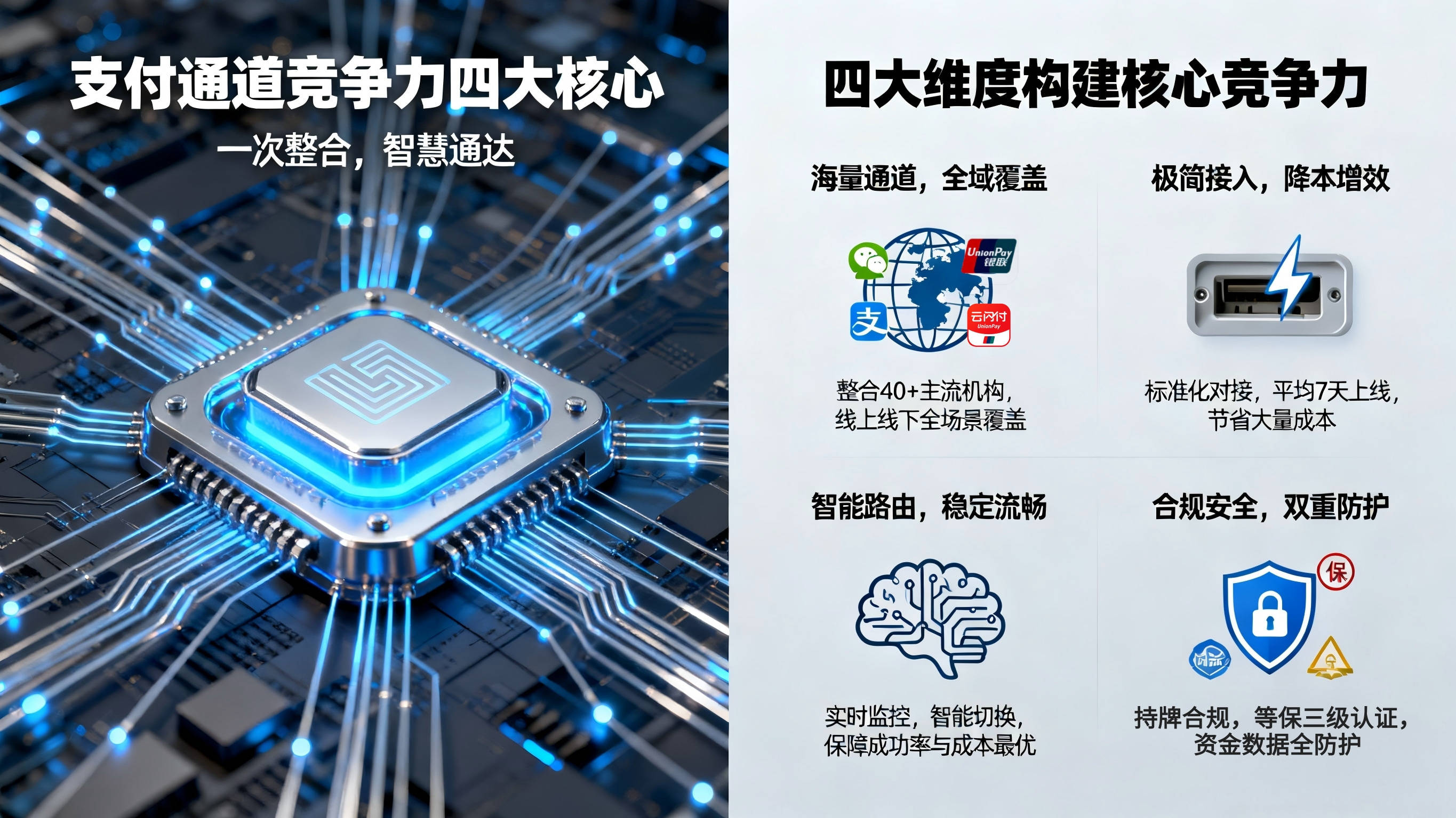 核心价值主张:一次接入40+支付通道,交易成功率提升至99.9%,通道对接成本降低70%,智能切换保障交易零中断。