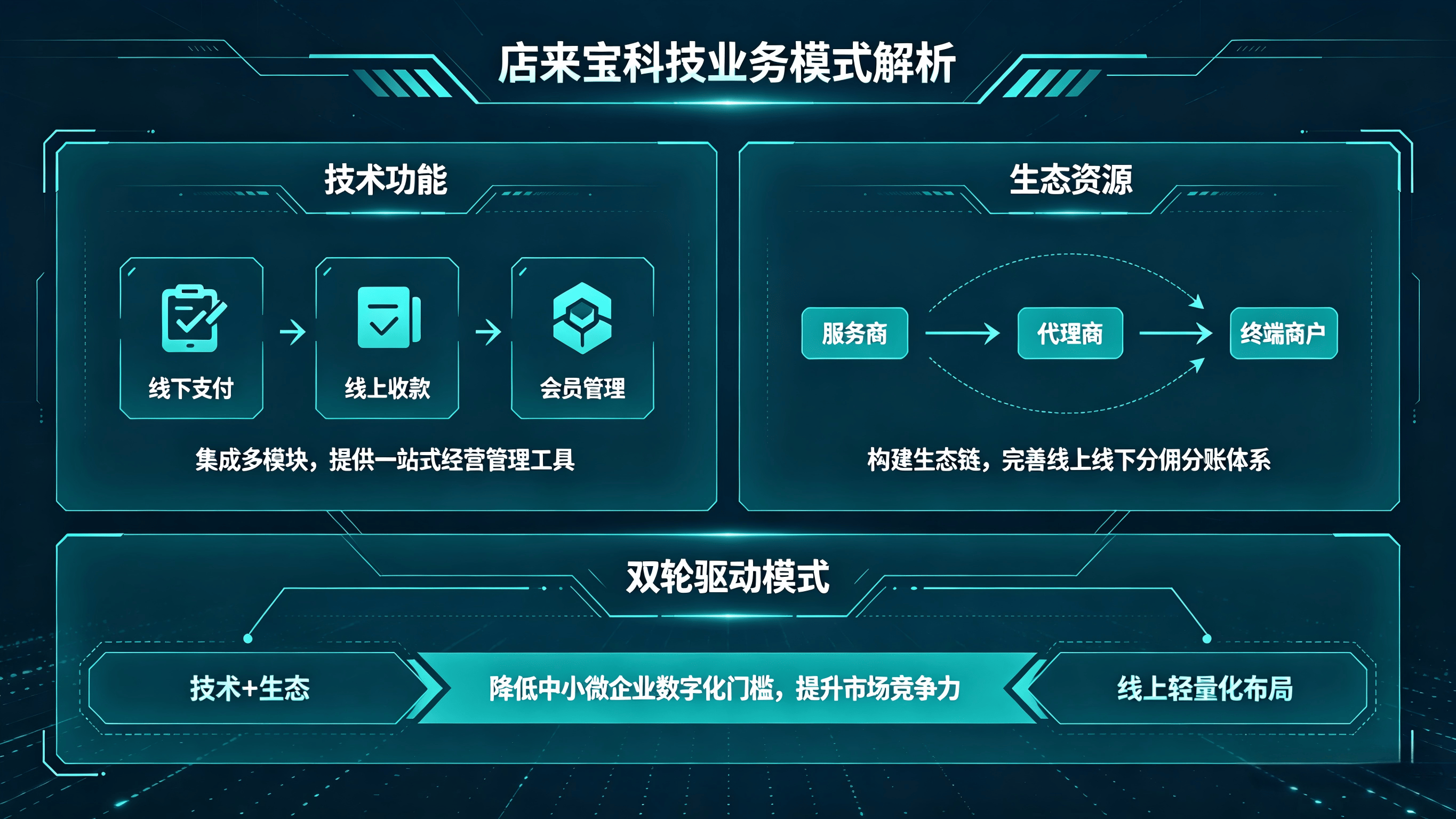 依托SaaS模式与多级代理体系,店来宝科技以线上业务为桥梁,实现跨行业资源整合。技术上,集成线下支付、线上收款、会员管理等功能,为商户提供一站式经营管理工具;资源上,联合服务商、代理商与终端商户构建生态链,完善线上线下一体化的分佣与分账体系。“技术+生态”的双轮驱动模式,叠加线上业务的轻量化布局,有效降低了中小微企业的数字化门槛,助力其提升市场竞争力。